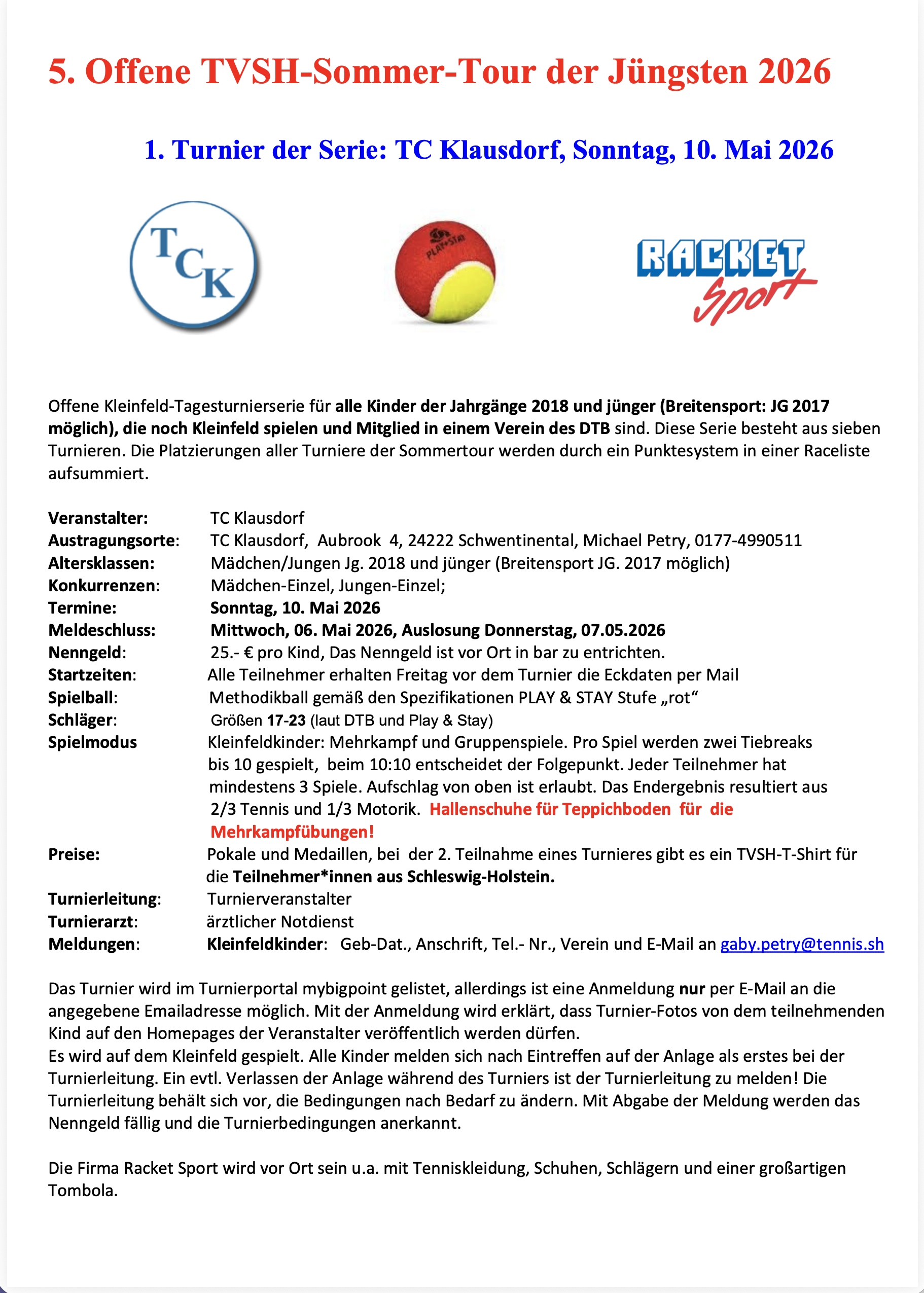 Start des 1. Kleinfeldturnieres im TC Klausdorf am 07.05.23 bei der „2.Sommertour der Jüngsten“ in Schleswig-Holstein!